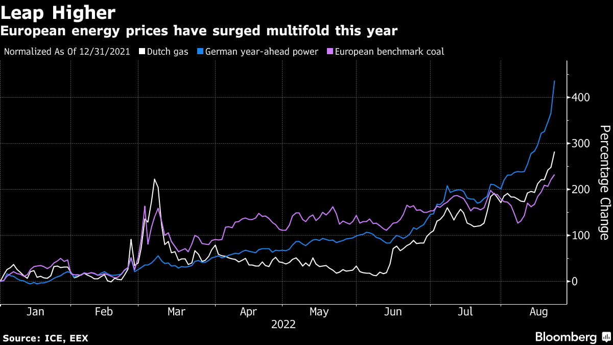 (Bloomberg) -- European gas and power prices surged as panic over Russian supplies gripped markets and politicians warned citizens to brace for a tough winter ahead.