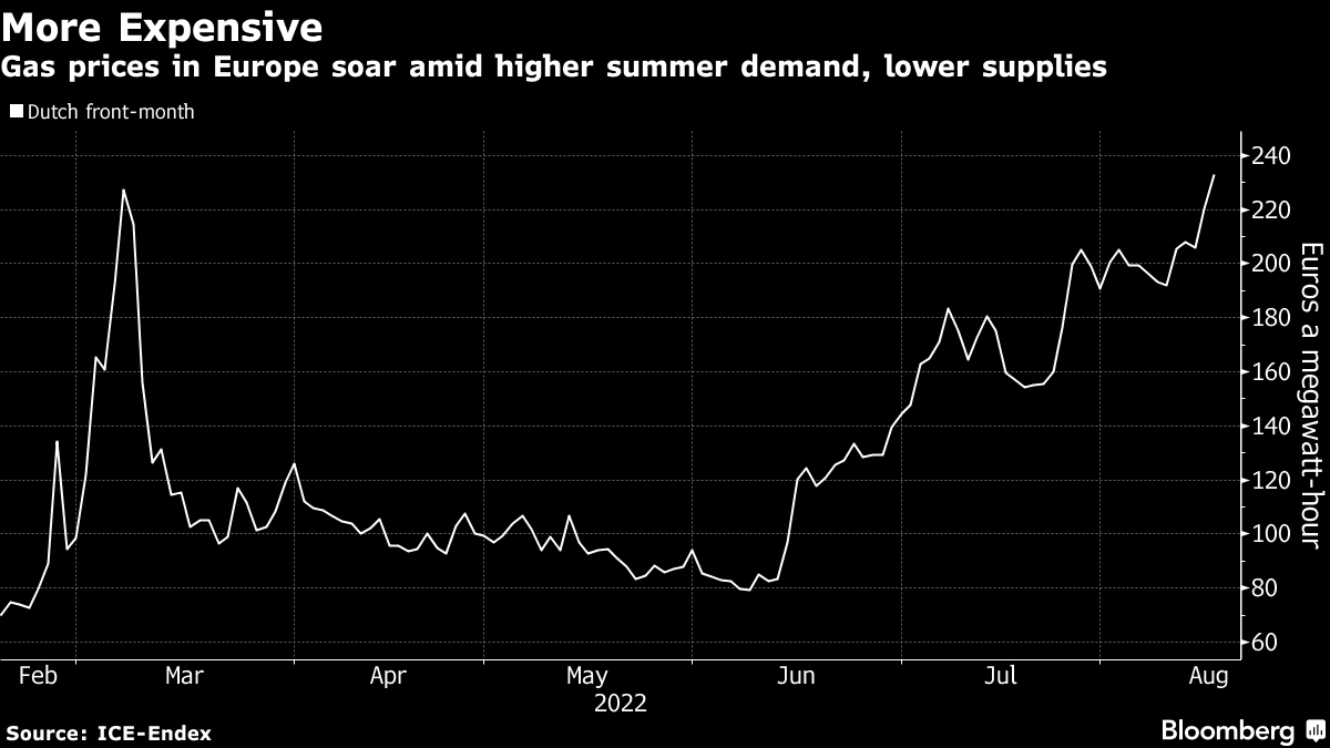 (Bloomberg) -- Natural gas extended gains as a scorching summer in Europe triggers higher-than-normal demand, exacerbating an energy crisis that’s threatening to push major economies into recession.