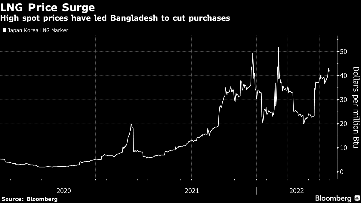 South Asian nations that are highly reliant on energy imports have been hit by surging prices, forcing cities to cut electricity supplies to cope with fewer imports. Bangladesh imported about 30% of its LNG on a spot basis this year, down from more than 40% last year, according to BloombergNEF.