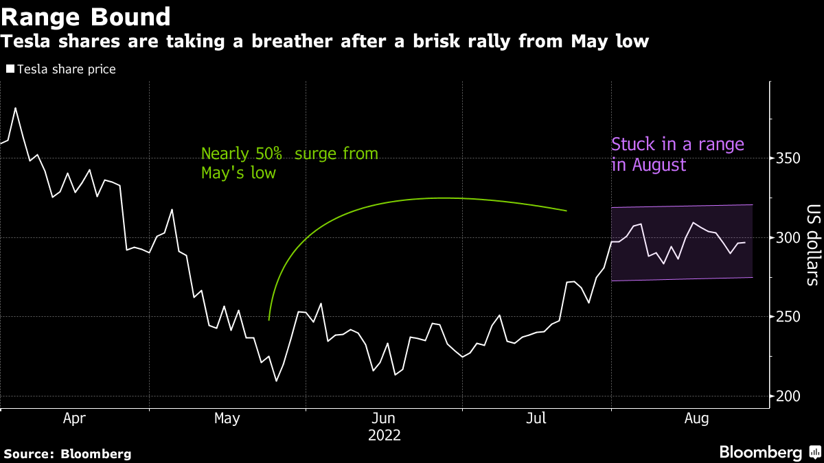 Riskier growth stocks like Tesla have borne the brunt of a souring equities market mood this year amid the threat of a recession. The stock is down 16% year-to-date, headed for its first annual decline since 2016. And having rallied 42% through Wednesday’s close since hitting a year low on May 24, the rebound has hit a wall in August as broader enthusiasm among retail investors has started to flag again.