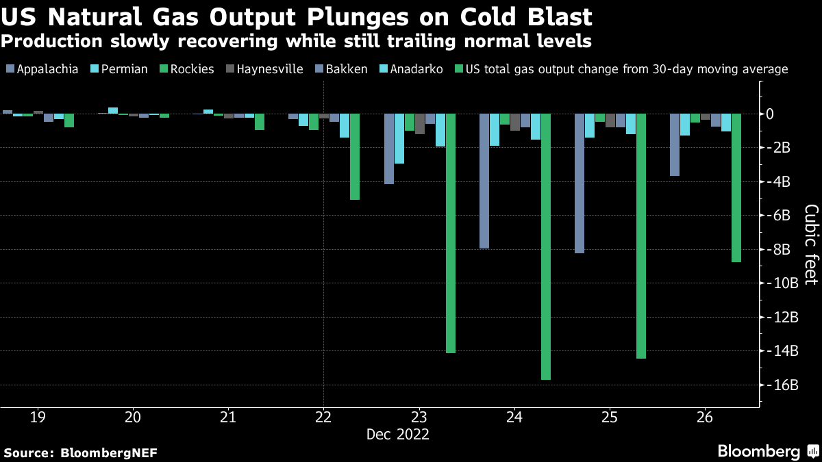 On Dec. 23, US natural gas production suffered its worst one-day decline in more than a decade, with roughly 10% of supplies wiped out because of wells freeze-offs. Output was as low as 84.2 billion cubic feet on Saturday, a 16% decline from typical levels, before a slow recovery started, according to BloombergNEF data based on pipeline schedules.