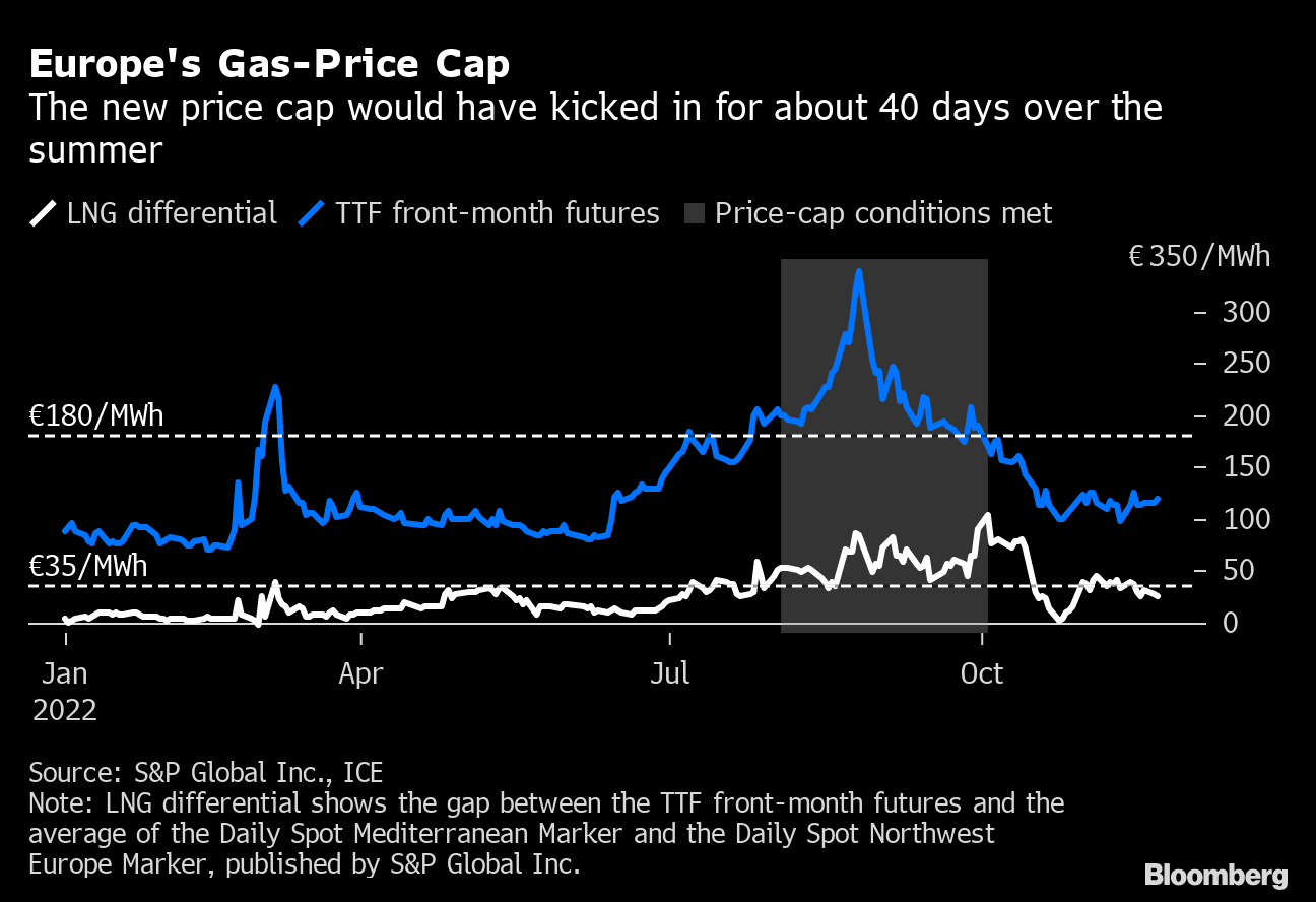 The cap, set to take effect Feb. 15, requires a few conditions before it is triggered: for three working days, the benchmark price must be above €180 ($191) a megawatt-hour and also at least €35 above global prices for liquefied natural gas.