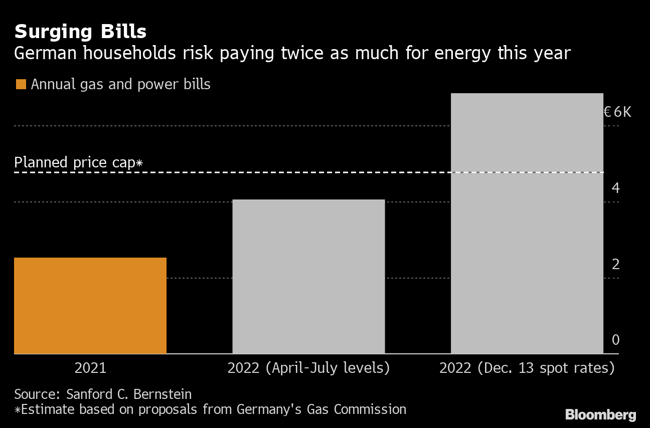 European gas futures have averaged about €135 a megawatt-hour this year after peaking at €345 in July. If prices go back up to €210, import costs could reach 5% of GDP, according to Jamie Rush, chief European economist at Bloomberg Economics. That could tip the shallow recession being forecast into a deep downturn, and governments will likely have to scale back programs in response.