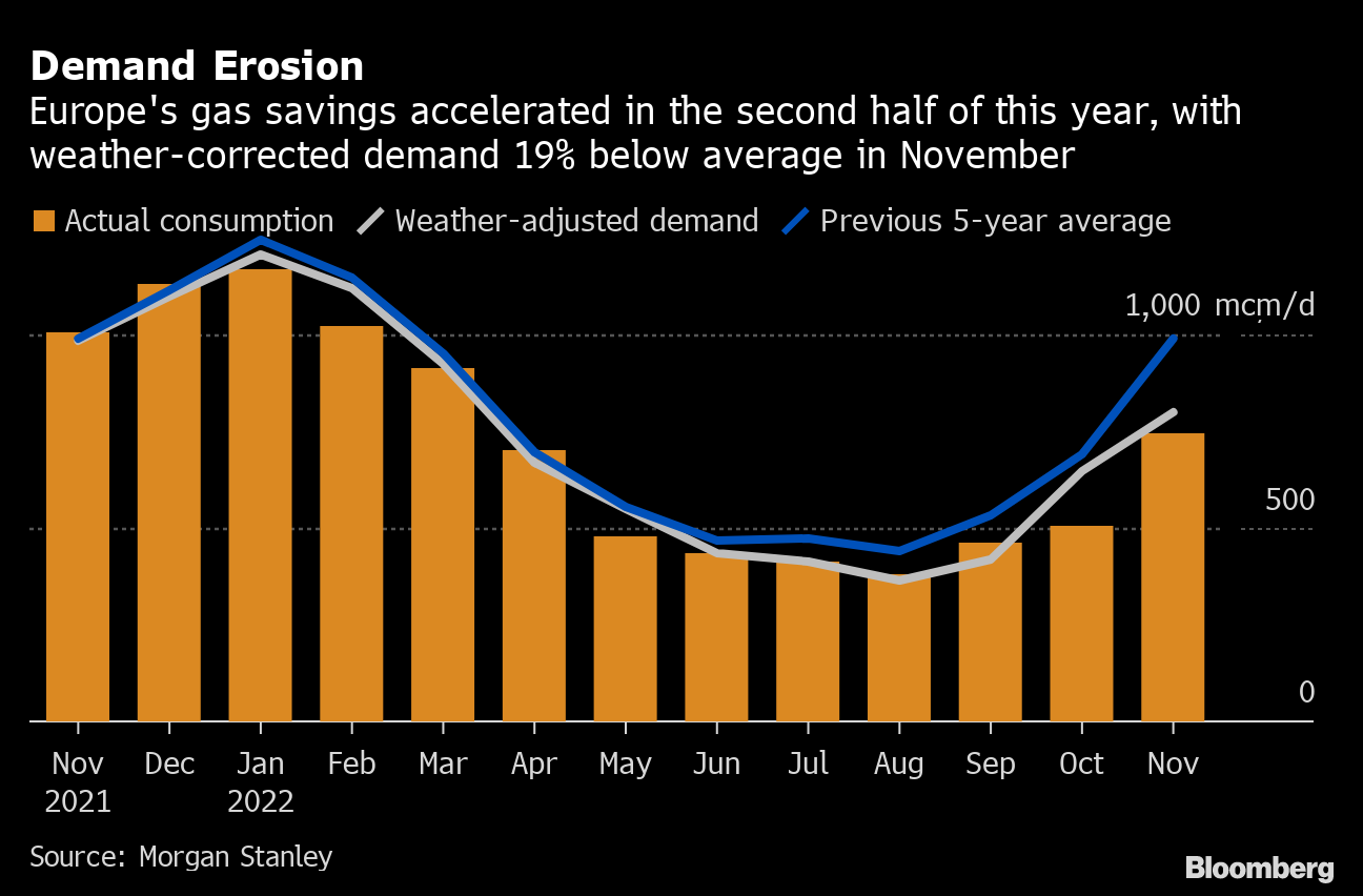 With supply tight, businesses and consumers have been asked to reduce usage. The EU managed to curb gas demand by 50 billion cubic meters this year, but the region still faces a potential gap of 27 billion cubic meters in 2023, according to the International Energy Agency. That assumes Russian supplies drop to zero and Chinese LNG imports return to 2021 levels.