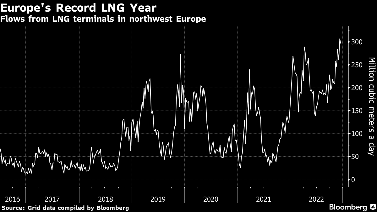 LNG imports into Europe are at record levels and new floating terminals are opening in Germany to receive the fuel. Government-backed buying has helped Europe attract cargoes away from China, but colder weather in Asia and a potentially strong economic recovery after Beijing eased Covid restrictions could make that more difficult.