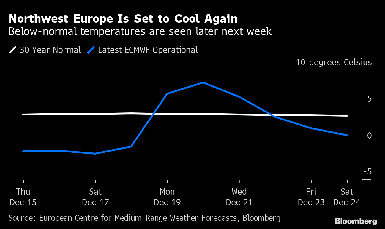 Benchmark futures rose as much as 3.3%, erasing an earlier loss. While warmer weather is expected early next week, temperatures are then set to fall below the seasonal average in the Nordics and the UK, according to forecaster Maxar.