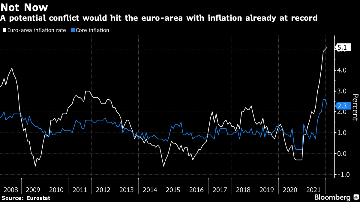 Europe is already battling surging living costs and a rocky recovery from the coronavirus pandemic. Adding uncertainty from a potential Russian invasion -- which the Kremlin has denied it’s planning -- could plunge the region into stagflation, according to Amundi SA, Europe’s biggest asset manager.