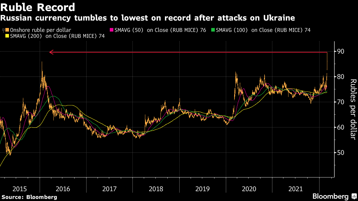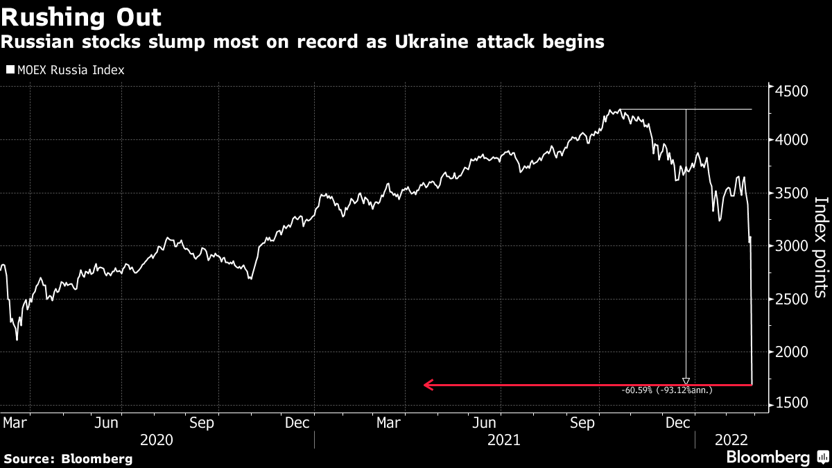 The military attack on Ukraine cast a shadow over global markets and sparked a fresh bout of risk aversion. Russian assets took the main blow after President Vladimir Putin ordered an operation to “demilitarize” Russia’s neighbor, prompting international condemnation and a U.S. threat of further “severe sanctions” on Moscow.