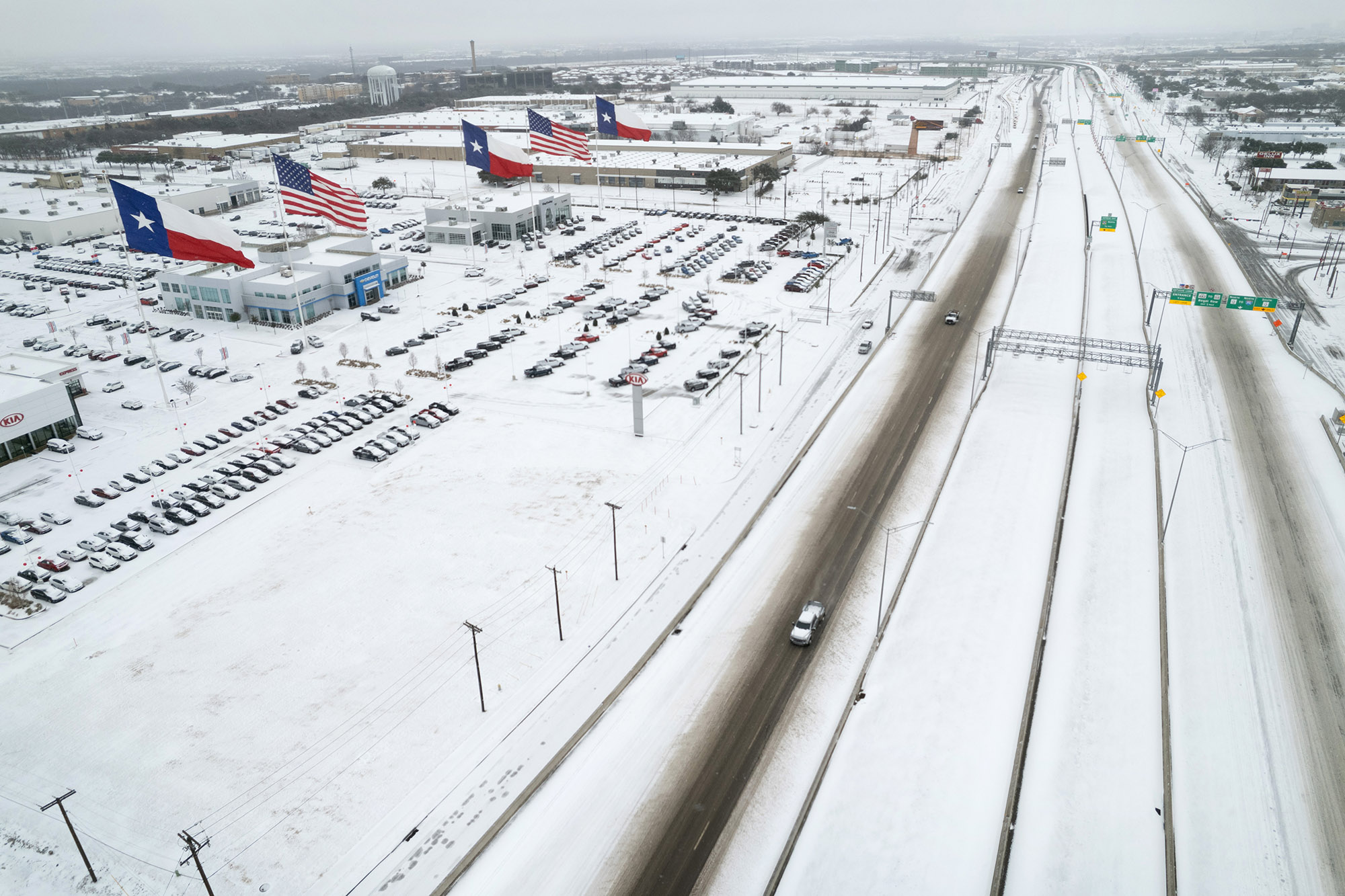 Traffic moves through snow and ice on U.S. Route 183 in Irving, Texas on Feb. 3.Photographer: John Moore/Getty Images