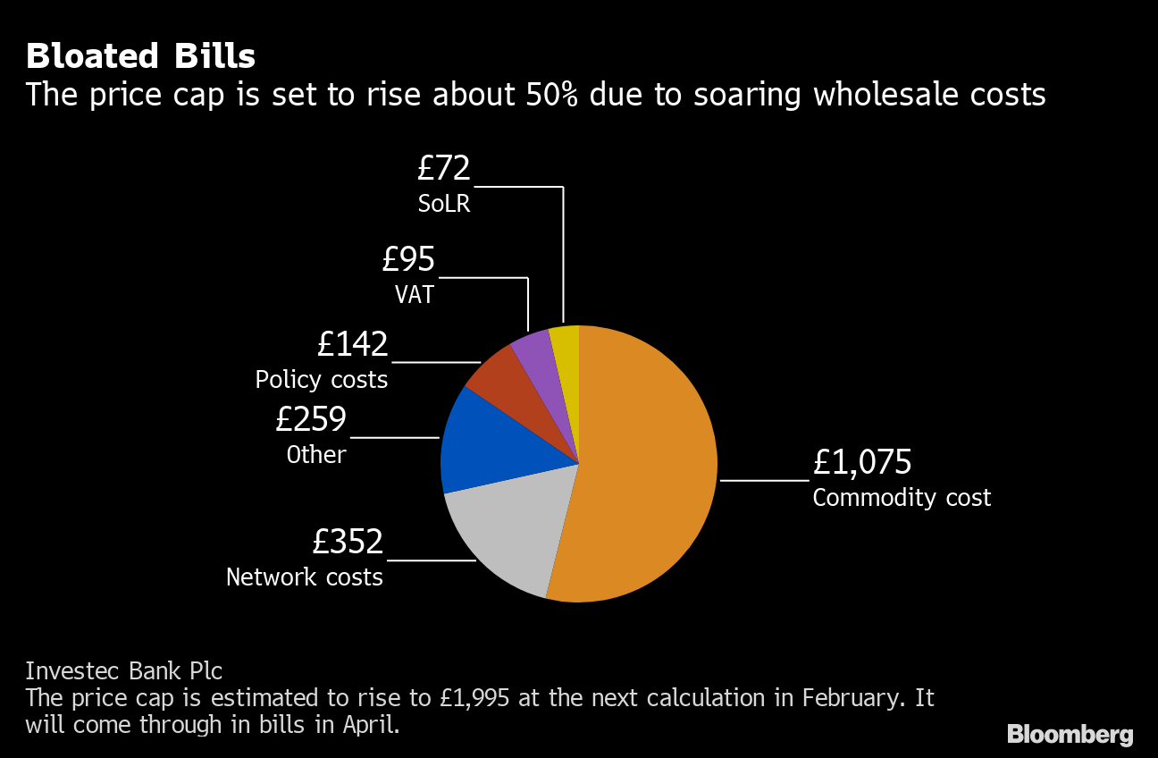 The energy bill for a typical household is set to jump 50% in April to almost 2,000 pounds, more than double the level set in 2017. An increase of that magnitude means the nation’s poorest may end up spending one of every eight pounds on energy consumption, according to Electricite de France SA.