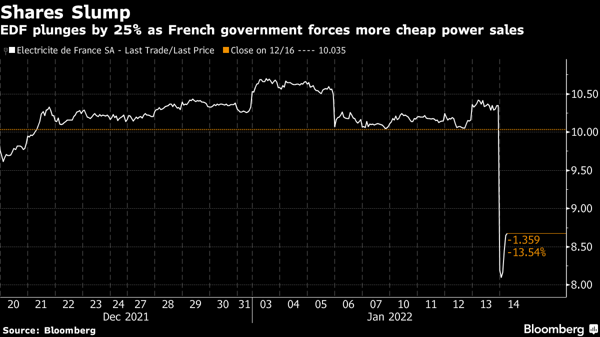 (Bloomberg) -- Electricite de France SA plunged by a record as the French government confirmed plans to force it to sell more power at a steep discount to protect households from surging wholesale electricity prices.