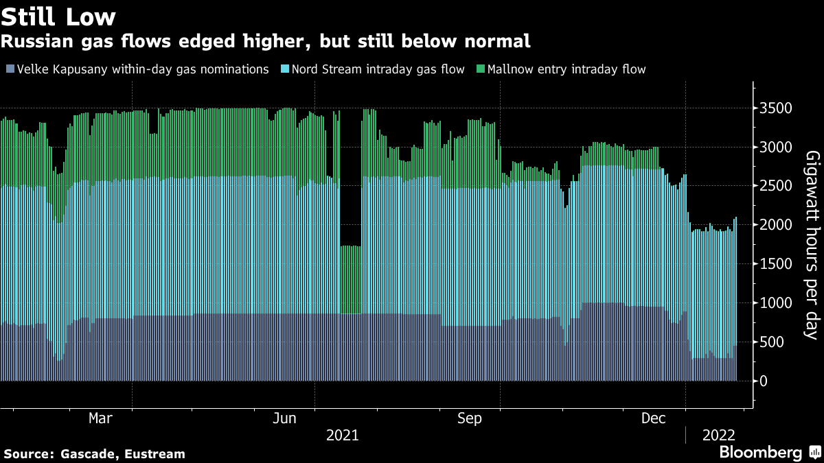 Despite higher Russian flows via Velke Kapusany, shipments are still below normal. Average flows in January last year were more than 760 gigawatt-hours a day, compared with 446 gigawatt-hours on Tuesday.