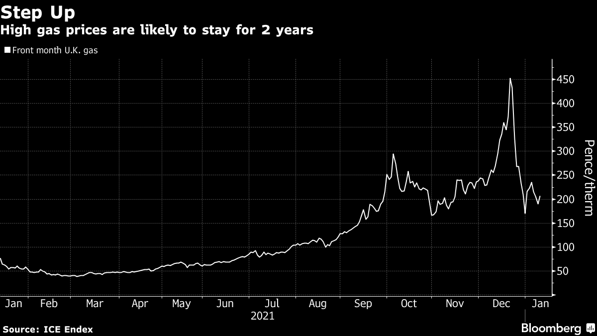 (Bloomberg) -- Natural gas prices are likely to remain high for the next two years, with very few options to boost supplies quickly, according to the chief executive of Britain’s biggest energy supplier.
