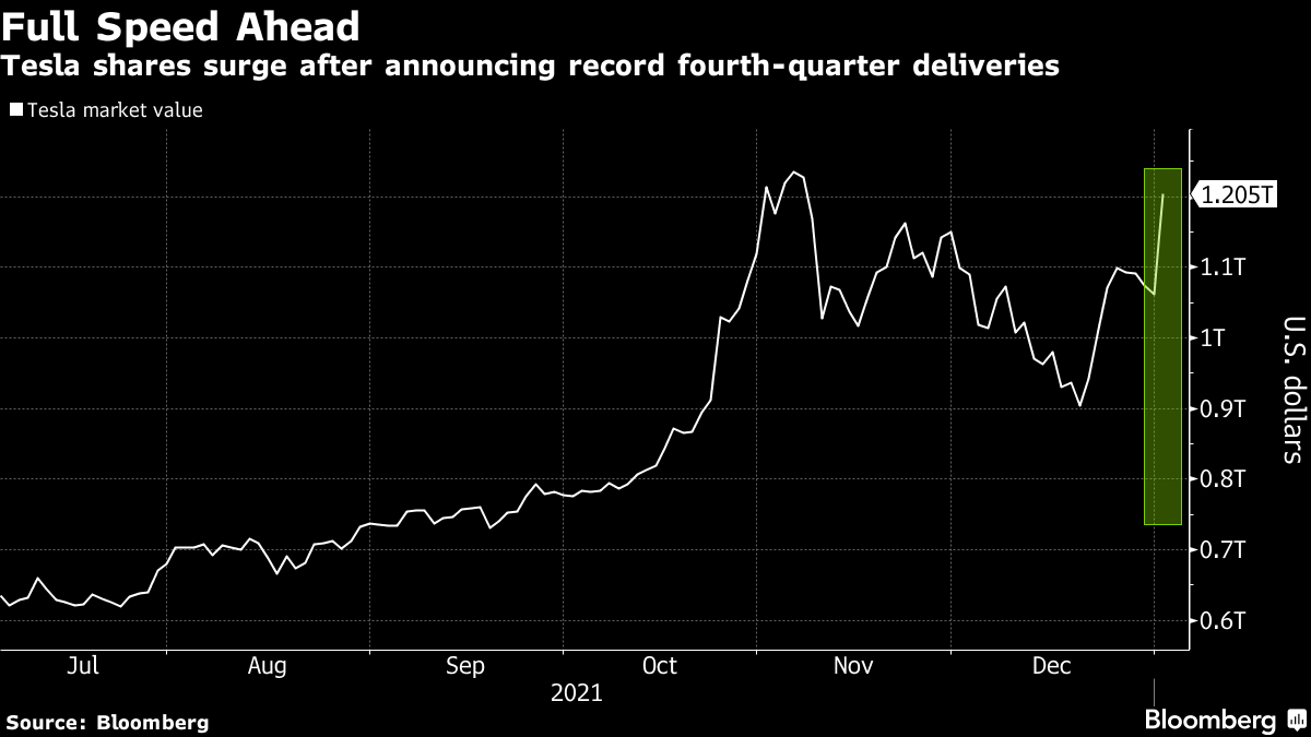 (Bloomberg) -- Tesla Inc. is off to a strong start to the new year after the electric-car maker smashed its quarterly record for deliveries in what one analyst called a “trophy-case” performance.