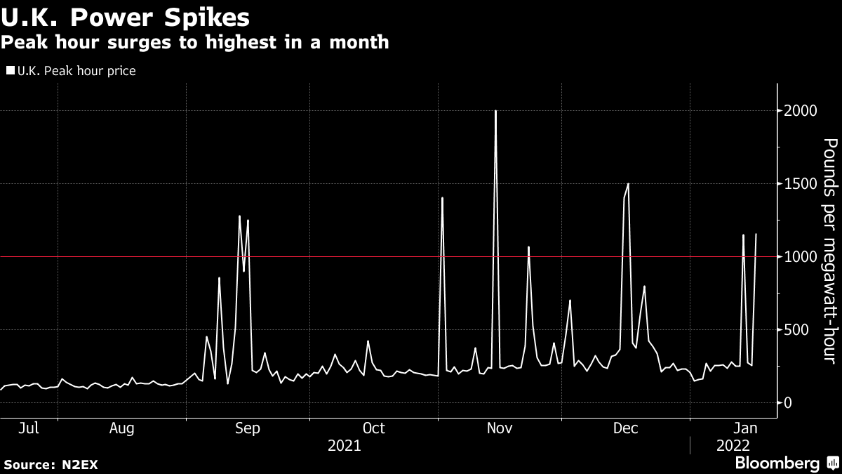 The contract for 5 p.m. to 6 p.m. London time jumped to 1,161 pounds ($1,589) a megawatt-hour, the highest since Dec. 16 on the N2EX exchange. At the same time, wind output is forecast to slide below 1.5 gigawatts, compared with a 10-day average of 6.3 gigawatts.