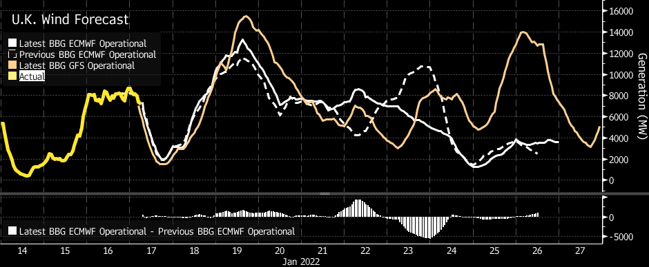 Gas was meeting 39% of demand, wind 26% and coal 4% on Monday morning, according to National Grid Plc data. Wind is forecast to increase from Tuesday, peaking above 15 gigawatts on Wednesday, Bloomberg’s model shows.