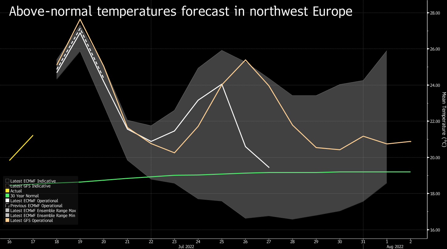 Meanwhile, temperatures in parts of the UK and France could rise to record levels Monday and Tuesday, according to forecaster Maxar. While this has raised solar power production -- Germany produced a record amount on Sunday and is set to exceed that level Tuesday -- it also cranks up demand for cooling. The heat wave is also boosting global liquefied natural gas prices.