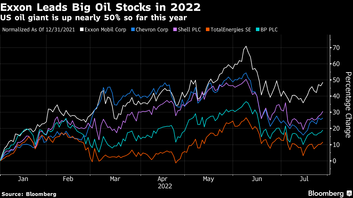 Exxon’s second-quarter adjusted earnings of $4.14 per share beat the $3.98 forecast by the Bloomberg Consensus. Net income reached $17.9 billion, surpassing the previous record set in 2008.