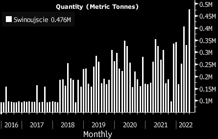 Poland’s liquefied natural gas imports surged to a record last month, as the nation also helps supply inland neighbors, such as Ukraine, and is seeking to boost its re-gasification capacity.