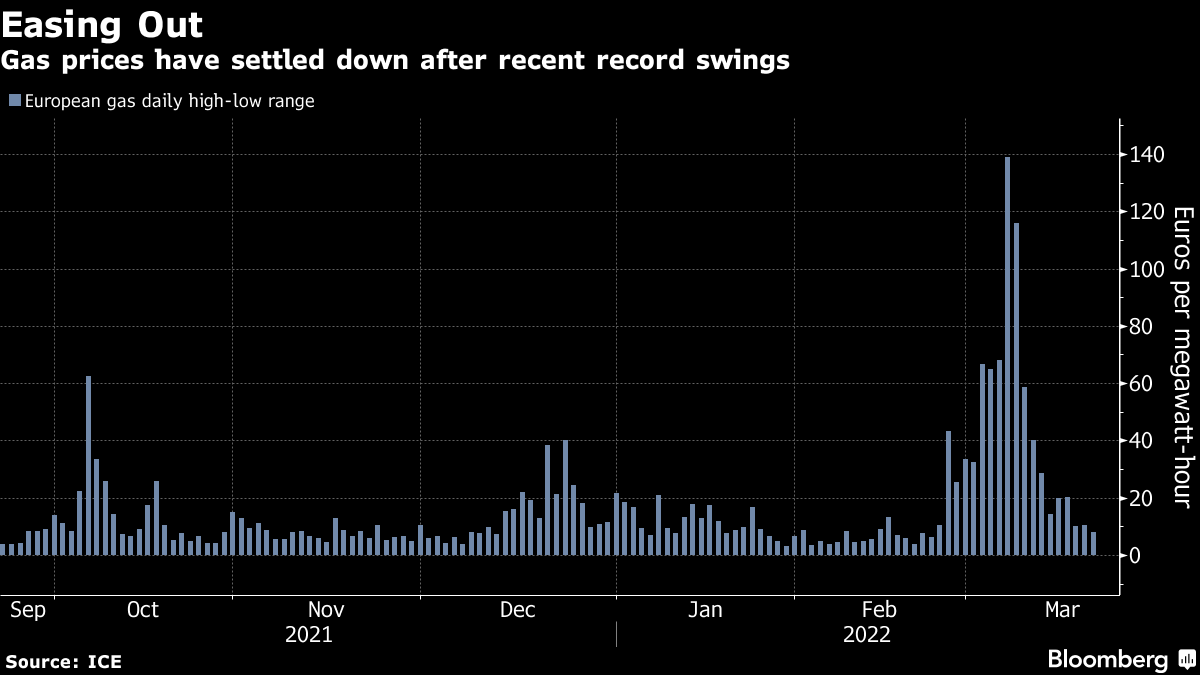 Gas prices have settled somewhat, following unprecedented volatility after the start of the war last month. Russia accounts for about 40% of the European Union’s gas demand, and about a third of those shipments transit Ukraine. The continent was facing a supply crunch even before the conflict, due to low storage levels that elevated prices.