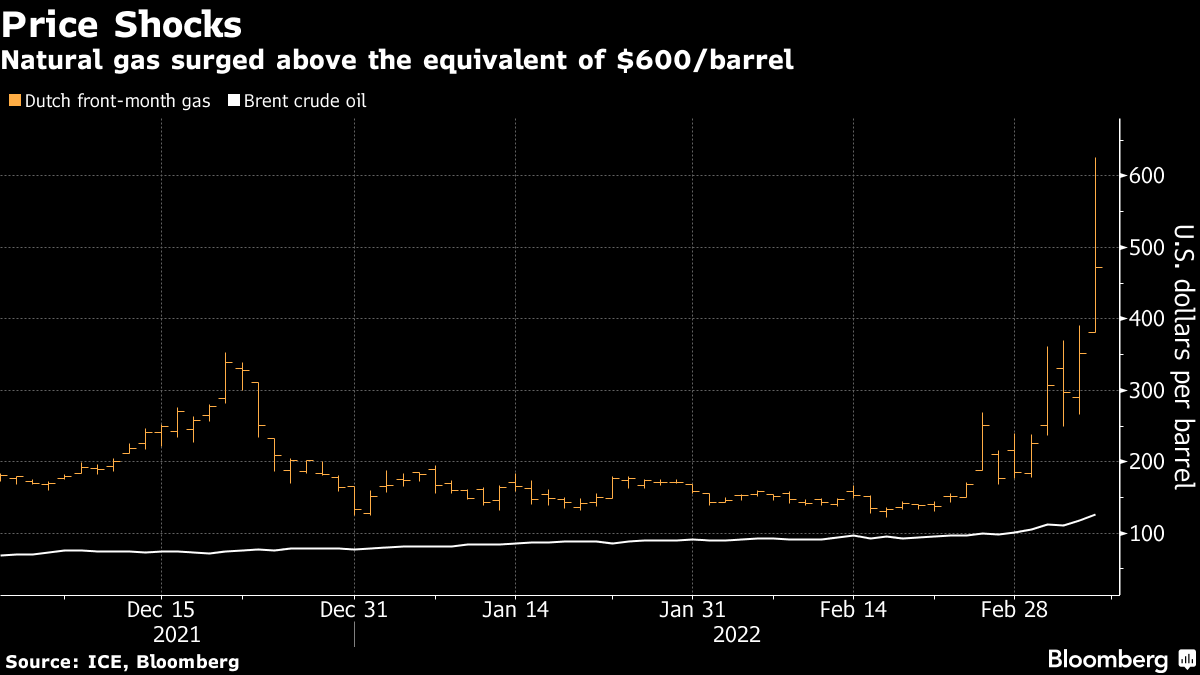 In some of the most chaotic trading the market has ever seen, benchmark gas prices leapt 79% to 345 euros a megawatt-hour. That’s the equivalent of more than $600 a barrel of oil. It extends a stunning rally following international sanctions targeting Russia that have upended commodity markets across the globe. Monday’s gas price surge is likely to lead to large margins calls, forcing companies to post more cash as collateral with exchanges to back their trades.