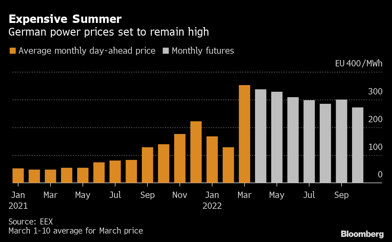 In one of the clearest signs of how the electricity market has been turned upside down as the war in Ukraine makes energy supplies more uncertain, German power futures for July are almost six times more expensive than the December average over the past ten years.