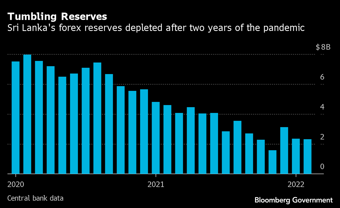 With a population of about 22 million, Sri Lanka is a net importer of goods from medicines to fuel. In December, petroleum products accounted for about 20% of inbound shipments and the cost jumped 88% from a year earlier. The increase in oil prices this year is adding to the burden.