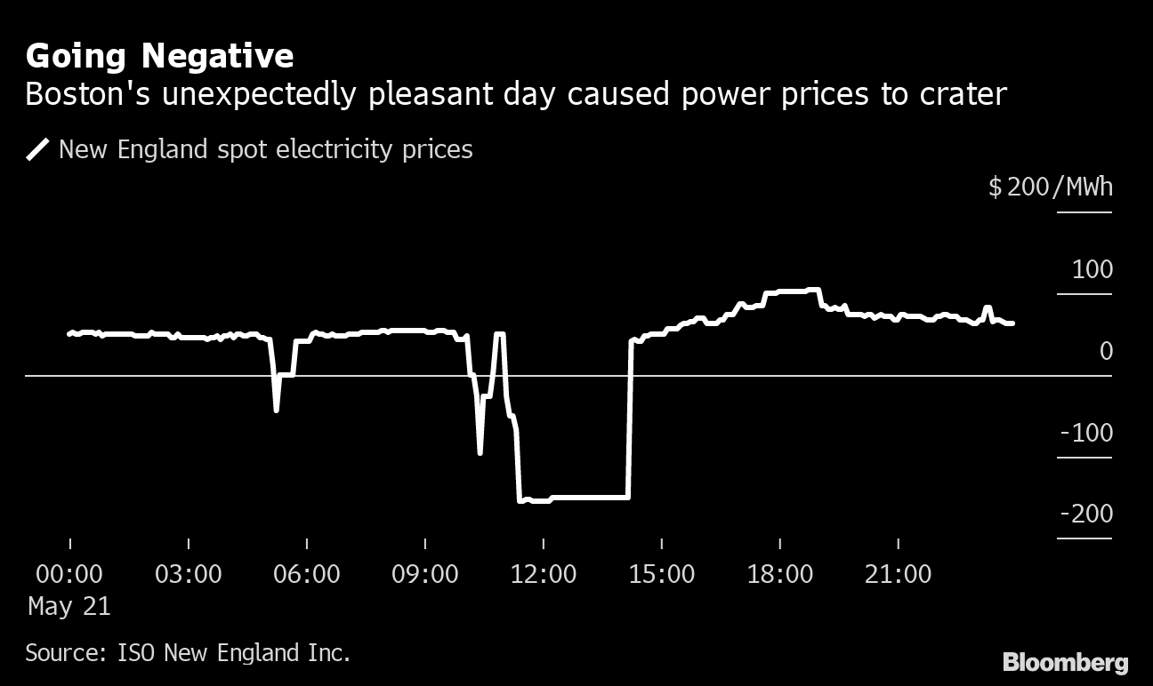 The city’s weather was so unexpectedly pleasant on May 21 that the New England grid had too much supply and some generators had to pay consumers to take their power, according to the grid operator. With clouds deflecting the worst of the sun’s heat, Boston’s high was just 71 degrees Fahrenheit (22 Celsius) instead of the blistering heat that had been previously forecast for the city, according to the National Weather Service.