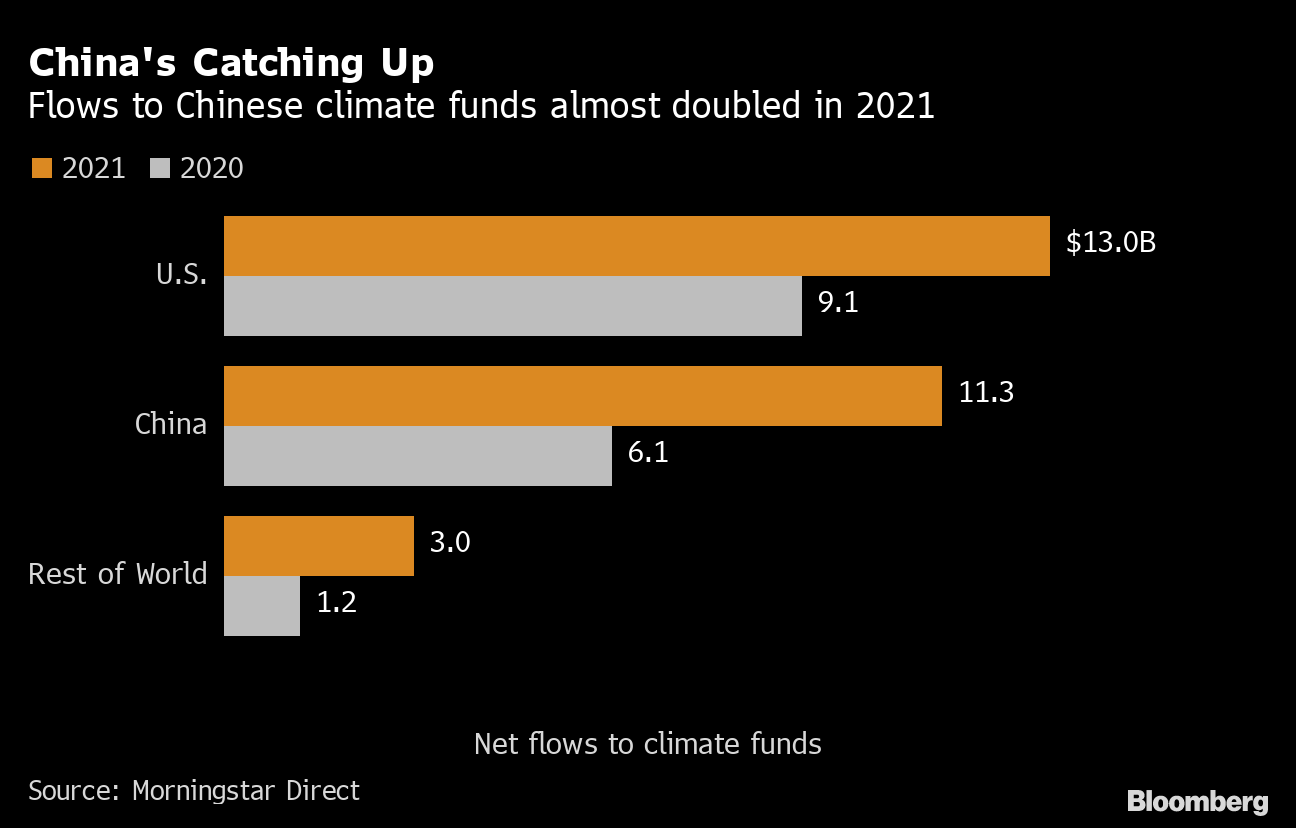 Investors in China added $11.3 billion into climate-focused funds last year, almost double their 2020 level. They were richly rewarded. Chinese climate funds were up 15% on average in the 12 months to April 2022, compared with a 7.2% decline for U.S. funds, according to Bloomberg calculations using Morningstar data.