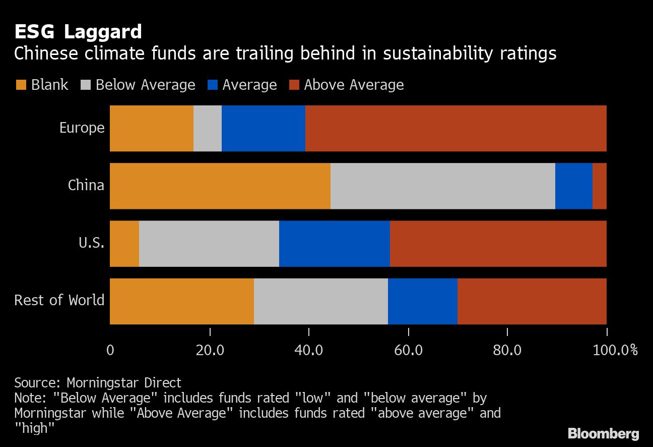 How environmentally friendly these funds really are is hard to tell. Of the 106 China climate funds analyzed by Morningstar, only 11 had sustainability ratings of “average” or higher. The rest were worse or unrated. Low ratings can reflect a number of ESG factors, including transparency, which is generally less robust in China relative to Europe or the U.S., and other governance factors.