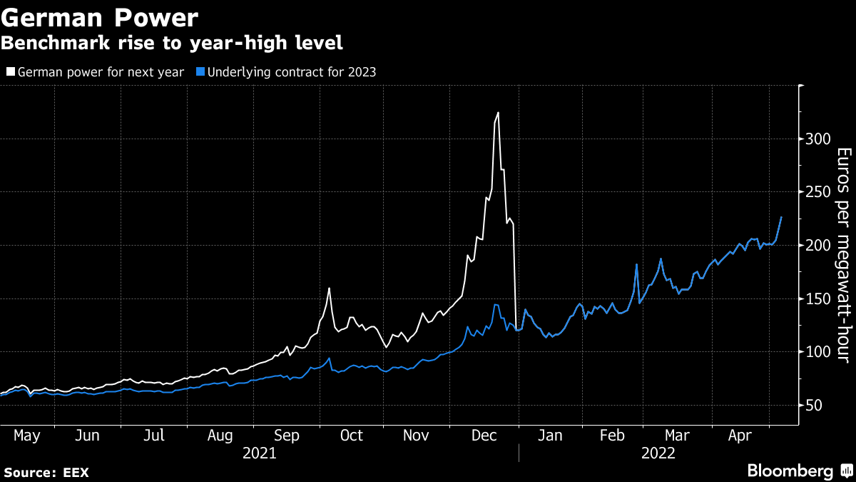 German next-year electricity, a benchmark for European power rates, rose to the highest level this year, while French, U.K. and Nordic prices climbed. As the EU plans to ban Russian oil over the next six months, traders are also watching Russia’s celebration next week of its World War II victory for more clues on how the war with Ukraine will develop.
