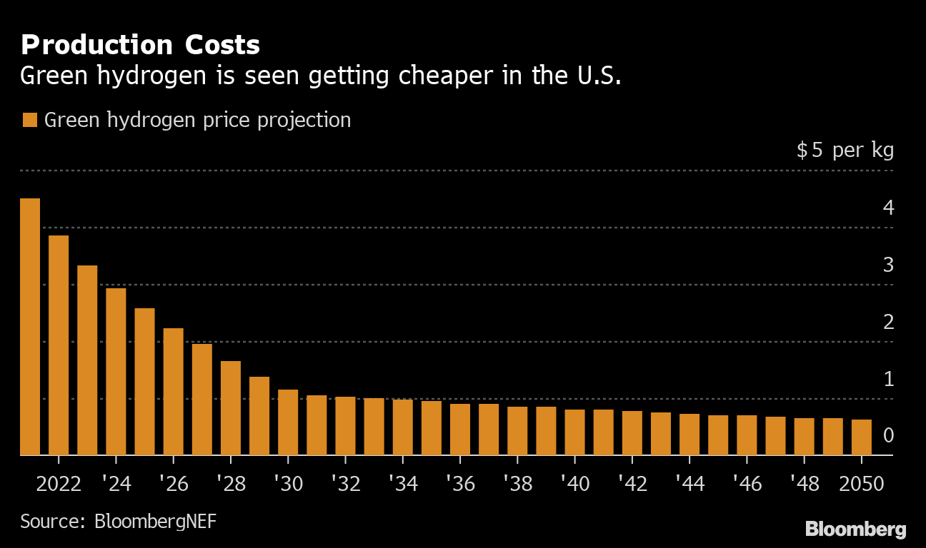 That process is expensive: Green hydrogen, the only carbon-free version, now costs about four to five times more than natural gas, according to a BloombergNEF report. That said, costs are forecast to fall rapidly between now and 2050, as long as investors are willing to be patient.