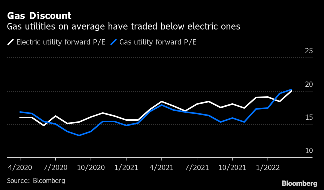 There’s no question why gas utilities whose entire business model appears to be under existential threat would be leaning into hydrogen as a potential savior: As a whole, they’ve been trading at a discount to electric utilities because investors are worried that anti-gas bans like those in California and New York City will erode their core business. With gas utilities now talking about decarbonizing their systems by blending in hydrogen or biogas — or even supplying pure hydrogen to industrial users in some cases — investors can more easily envision a future for gas-powered utilities.