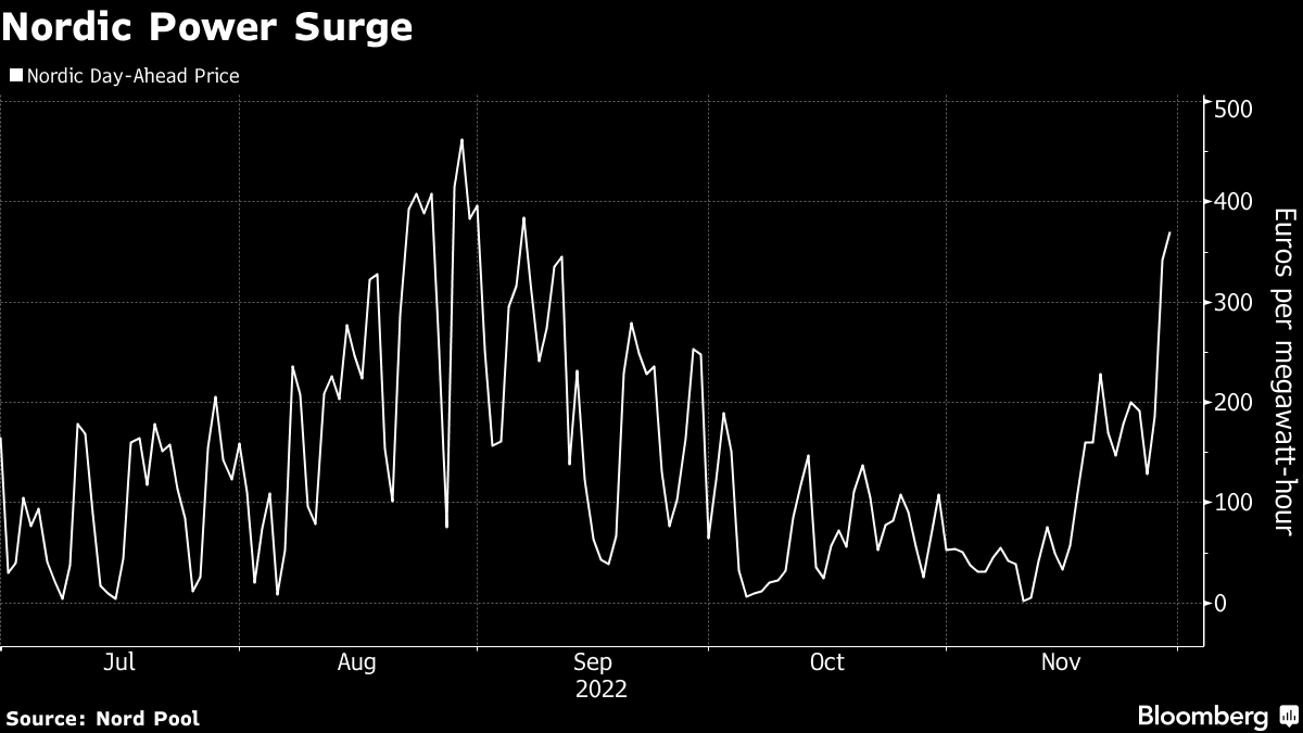 Power prices are already on a tear. The Nordic daily rate for Wednesday surged 8.2% to 373.23 euros ($387) per megawatt-hour, the highest level since the height of the energy crisis in September, on the Nord Pool exchange in Oslo. Key to the price moves is how much water is available in the region’s vast reservoirs, and how much producers decide to hold back for later in the winter when prices may be even higher.