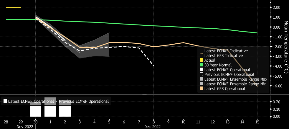 (Bloomberg) -- Temperatures are poised to plunge next month in Northern Europe as cold air blows in from the Arctic in what will be the first proper winter test for the region’s fragile energy systems.