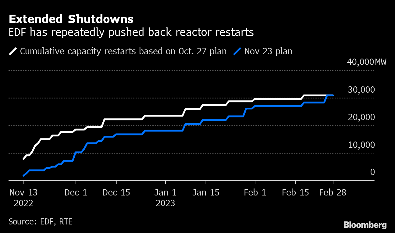 The power crunch, combined with Russia’s gas supply cuts to Europe, has raised energy prices across the continent. The importance of France’s nuclear fleet was highlighted this week as the UK faced the first test of winter, with cold temperatures combining with low wind speeds during the evening peak of power demand. Imports from France to the UK surged Tuesday evening to help fill the gap.