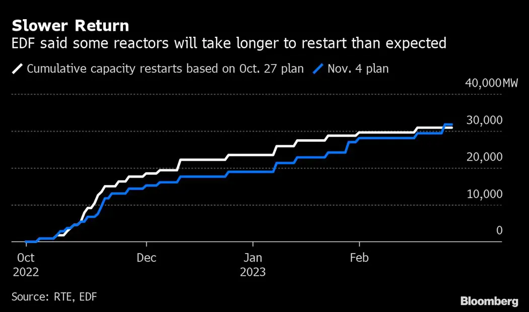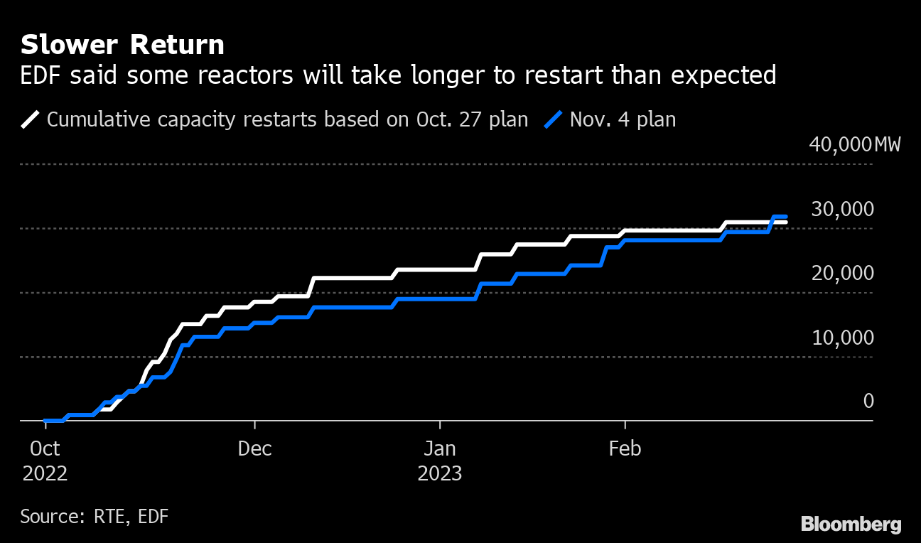 EDF has extended to next year outages at four reactors that were due back online in the coming weeks, with startup now projected for late January and February because of inspections and repairs. The French government is set to fully nationalize the utility in an attempt to ramp up repairs and build out more capacity. It's likely the country will rely on neighbors like the UK and Germany to send it power to keep the lights on for some of this winter.