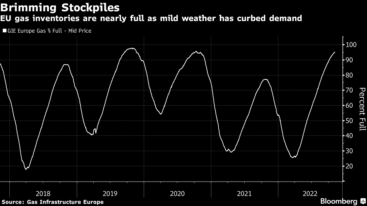 Meanwhile, warmer-than-usual weather has kept a lid on heating demand and delayed withdrawals from storage sites, which are 95.3% full, according to Gas Infrastructure Europe. Forecasts show above-average temperatures in northwest Europe are set to persist until the end of the month.