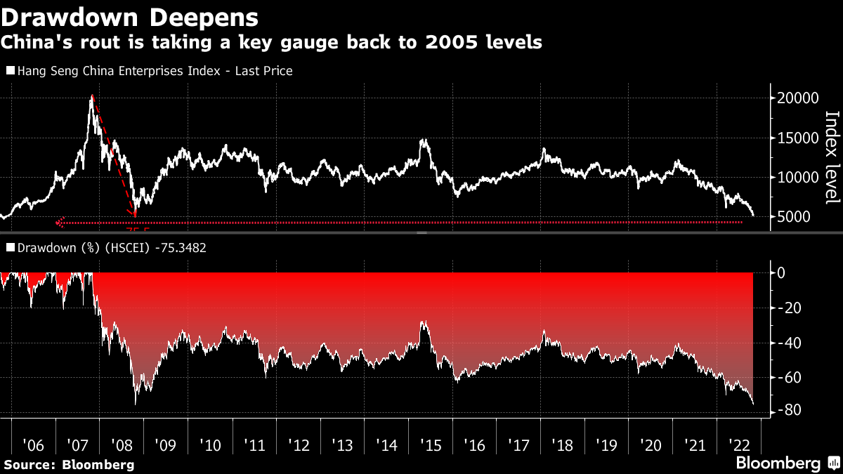Down 40% this year, the Hang Seng China Enterprises Index is the worst performer among more than 90 global equity measures tracked by Bloomberg.
