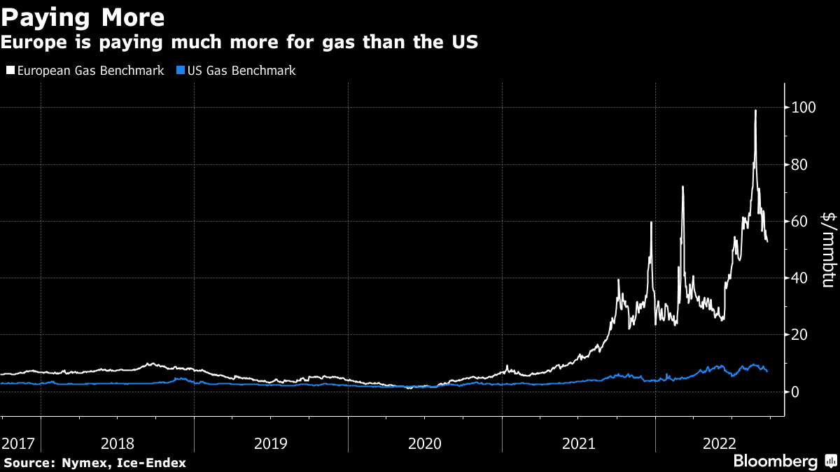 Governments across Europe, where industrial production accounts for roughly a quarter of the economy, are taking emergency actions to shore up utilities and cushion the impact of the crisis. The UK this week announced an estimated £40 billion ($44.8 billion) plan that would cap wholesale energy prices that feed into gas and power contracts for businesses for six months.