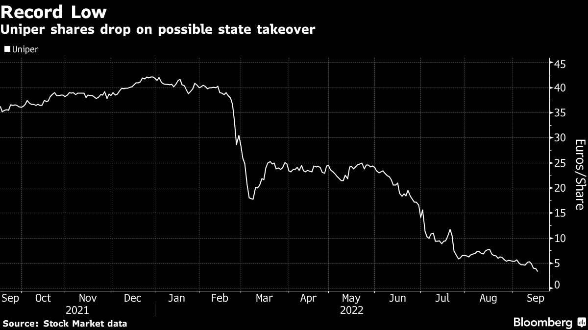 Shares in Uniper dropped for a fourth day, down as much as 16% to a record low after Bloomberg reported the government is close to taking control of the company.