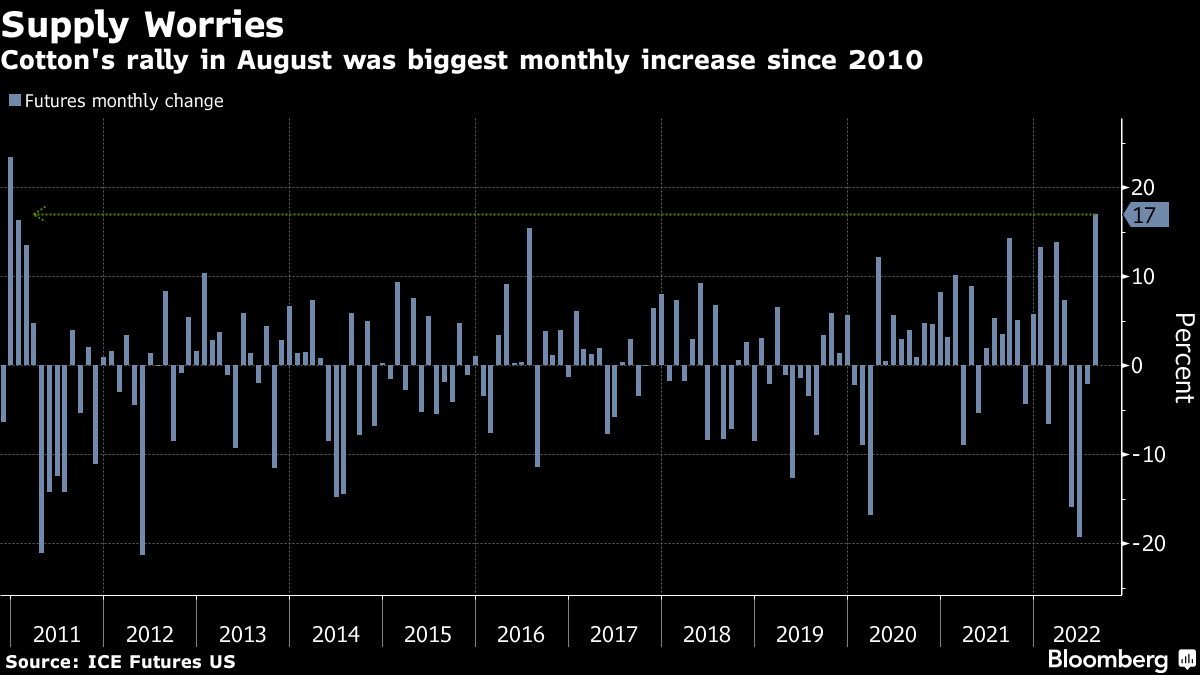Cotton crops across the southern states are also vulnerable to extremes. Drought has already hurt top US grower Texas, crimping global supplies and contributing to the 17% surge of cotton futures in August, the biggest monthly jump since late 2010. American cotton supplies are even more important now after catastrophic flooding ruined a big portion of the crop in Pakistan, the fifth-largest producer, in the past week.