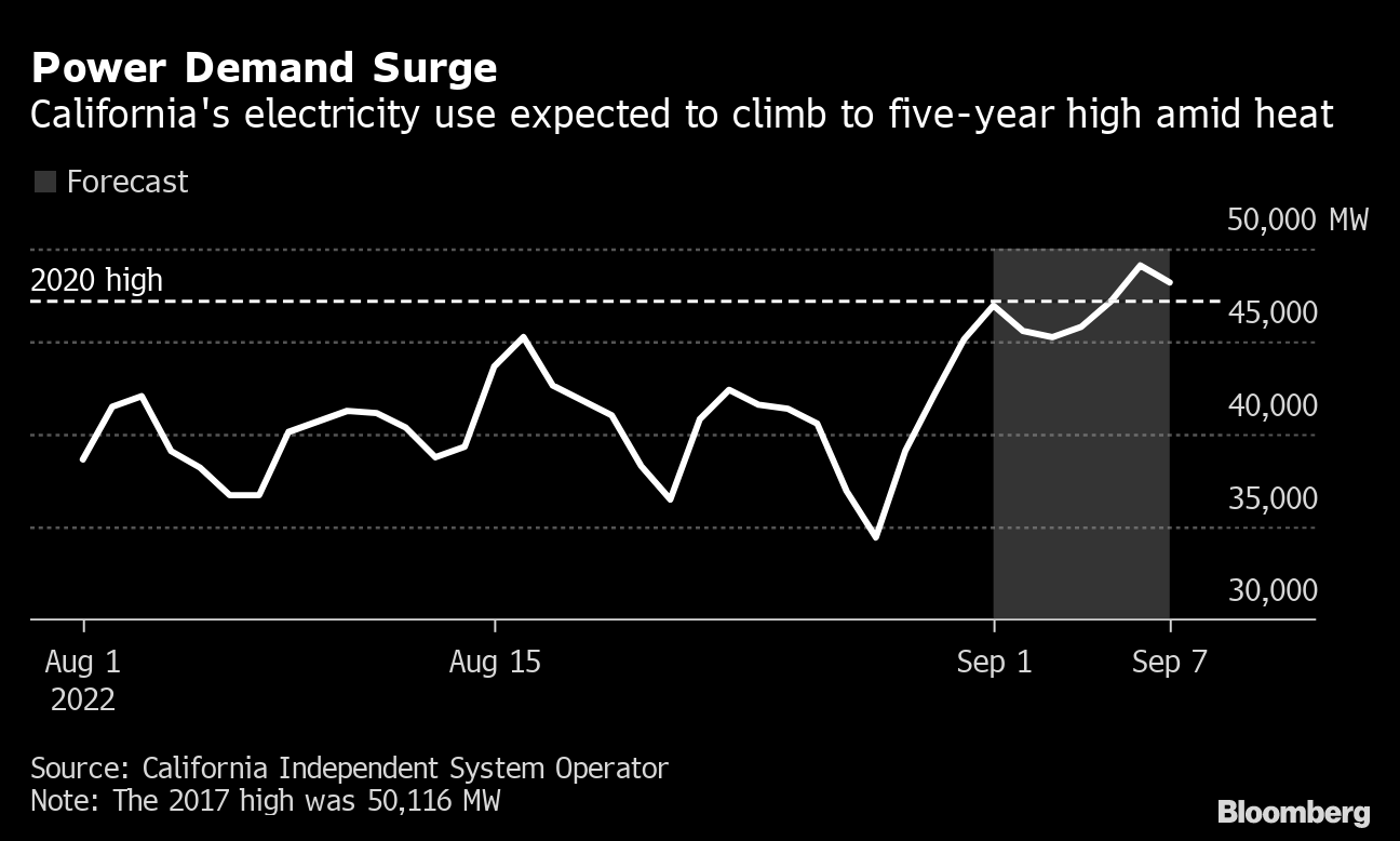 The heat wave is exacerbating drought conditions, taxing agriculture and raising the risk of wildfires, while prompting Californians to crank up air conditioning and stress the state’s power network. California’s grid operator expects electricity demand to surpass 47 gigawatts on Monday and reach 49 gigawatts Tuesday, which would be the highest since 2017. The all-time peak is almost 50.3 GW hit in 2006. A gigawatt is enough to power 750,000 Californian homes.