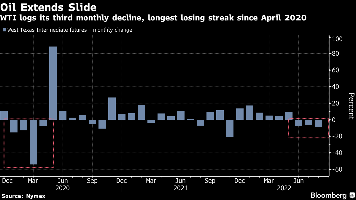 Oil rounded off three straight monthly losses this week, its longest slump in over two years, and has tumbled below $100 a barrel on fears over slower economic growth in China and tighter monetary policy in the US. The plunge prompted hedge fund star Pierre Andurand to brand the futures market for crude as “broken.” To gauge whether the selloff has further to go, traders will turn to the latest monthly meeting of the OPEC+ alliance, which convenes by videoconference on Monday.