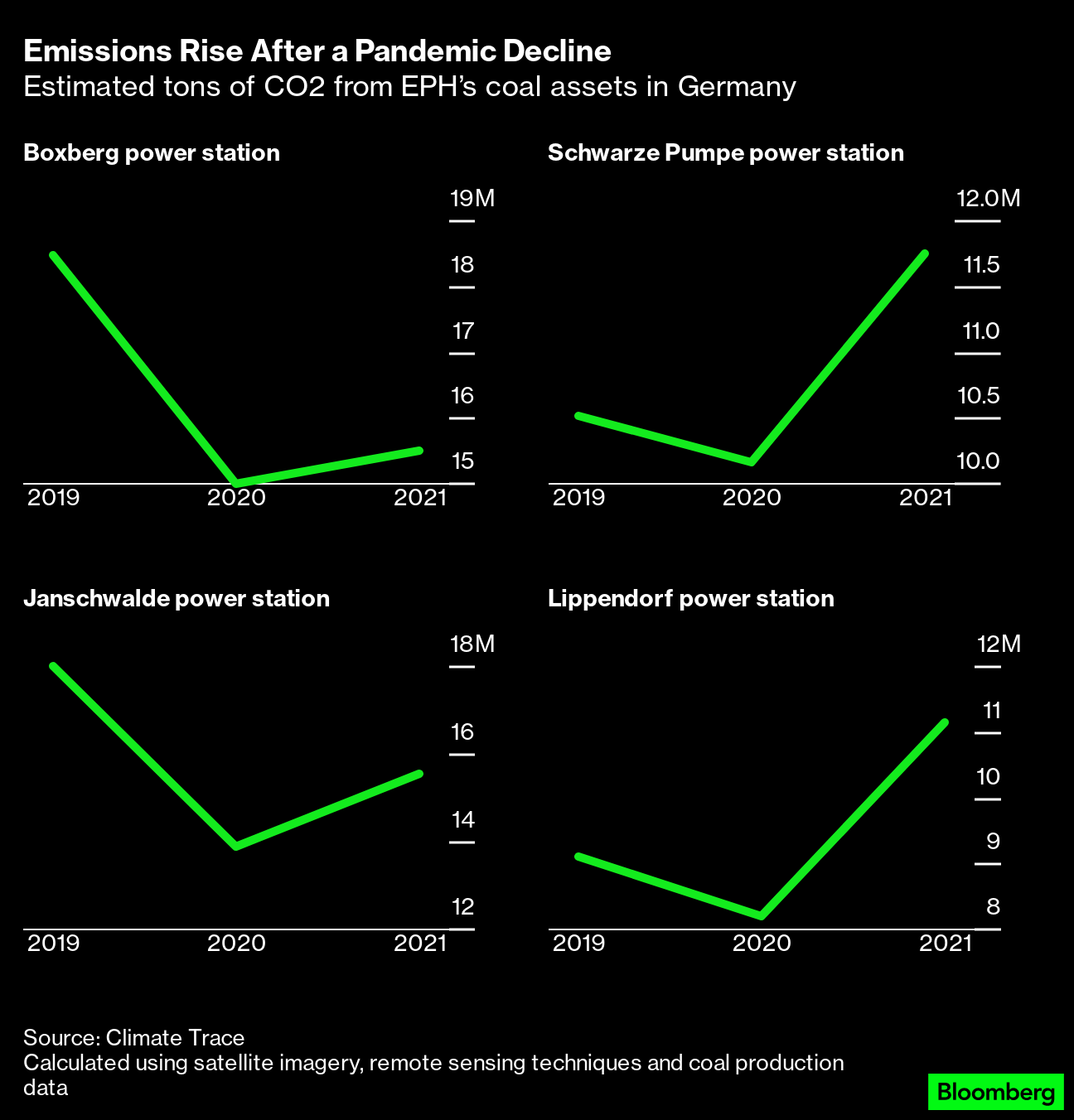 EPH makes minimal disclosures on emissions, and its executives rarely give interviews. But data compiled by the Europe Beyond Coal campaign show the Jänschwalde operations continued to pump carbon into the atmosphere under EPH’s control, even as pandemic-era lockdowns caused energy consumption to plunge. From 2020 to 2021, emissions rose at each of four major German coal plants owned or co-owned by EPH, according to satellite and remote-sensing data analyzed by Climate Trace, a nonprofit group. Climate Trace didn’t study other major coal facilities in Germany, where emissions generally rose after pandemic lockdowns were lifted.