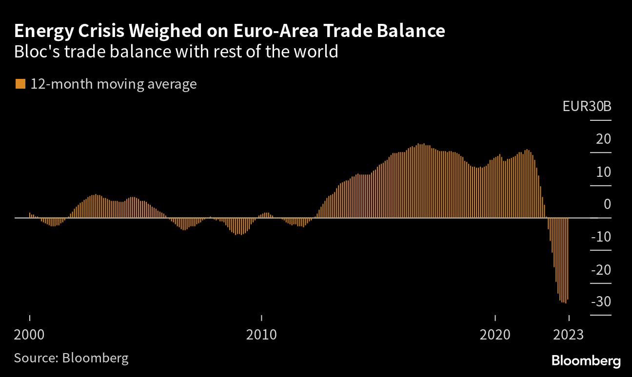 The euro-area hasn’t reported a single month of trade surplus since September 2021, the longest negative streak since the common currency was created. The deficit reached a record €46 billion in August and has since narrowed to €62 million in February, but the 12-month moving average is hovering around €25 billion since October, which euro bears say is a red flag.
