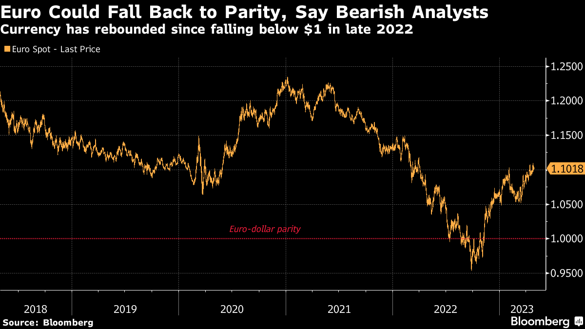 The call goes against the consensus view that the European Central Bank’s interest-rate hikes will lead the currency to extend its 16% rally since September, when it last reached parity. The median forecast in a Bloomberg survey is $1.12 by the end of the year and the most bullish analysts see it approaching $1.20.