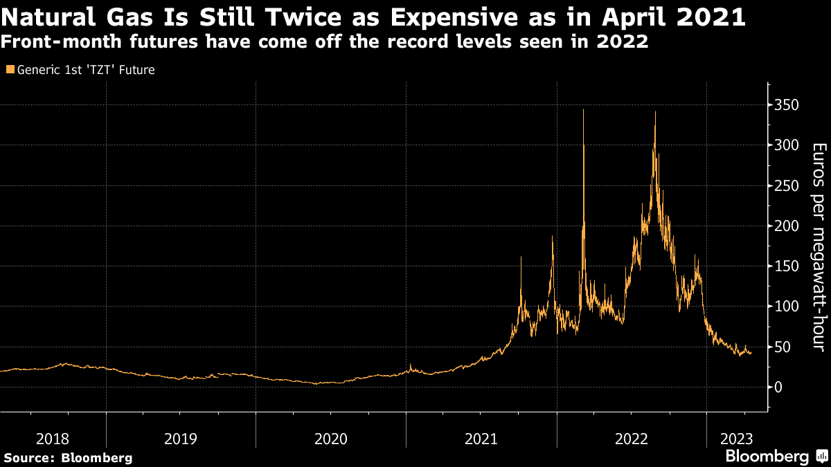 European natural gas prices have come off the record highs reached last year, but are still double the levels seen two years ago. Front-month futures hovered around €39 a megawatt-hour and Energy Aspects Ltd. forecasts them to climb to €47.20 in the coming months and €71.80 later in the year.