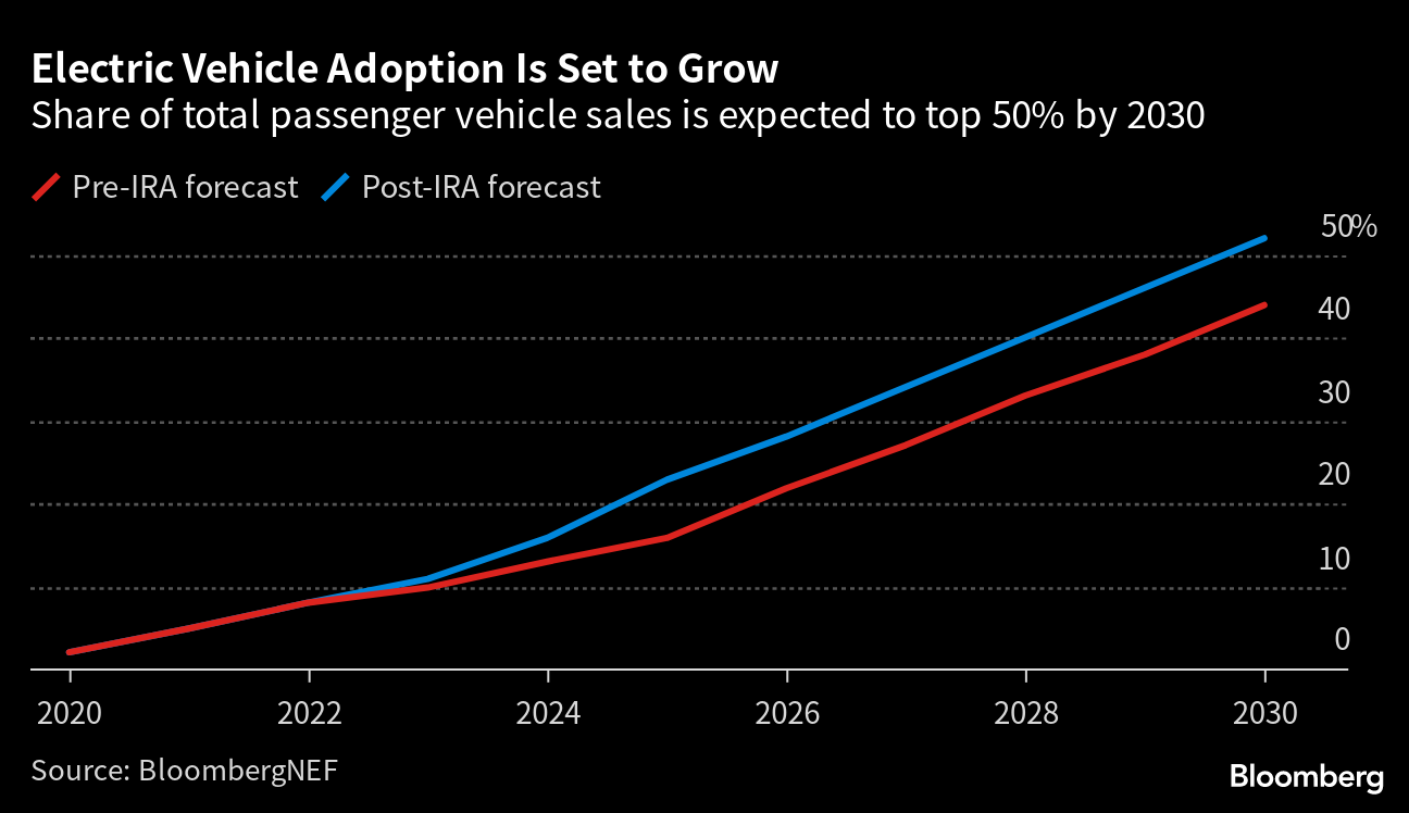 The Biden administration is expected this week to propose the toughest-ever curbs on pollution from new cars and light trucks, while stopping short of mandating zero-emission electric vehicles or barring the sale of conventional gas-powered models. The standards, to be released Wednesday by the US Environmental Protection Agency, are likely to govern tailpipe emissions from vehicle model years 2027-2032, according to people briefed on elements of the plan. While EV adoption is forecast to expand, BloombergNEF data show, growth could be limited in the near term by coming requirements governing what consumers are eligible to claim from Inflation Reduction Act tax credits of as much as $7,500 per vehicle.