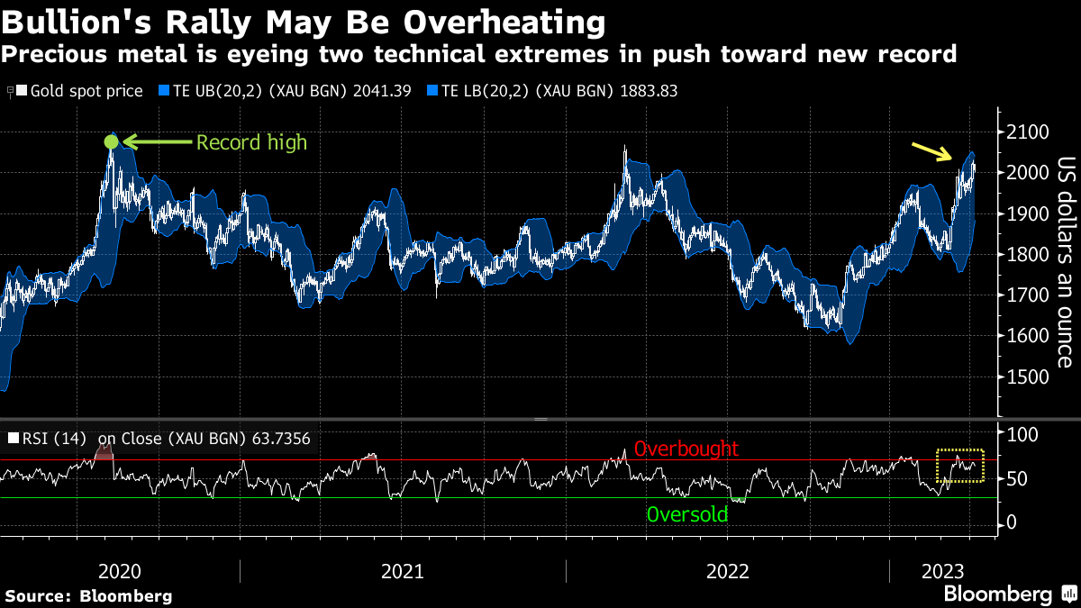 Spot gold has been on a tear, surging above $2,000 an ounce as weaker-than-estimated economic data revived concerns that the US is heading toward a recession amid the Federal Reserve’s aggressive tightening stance. While bullion, the safe haven of choice in uncertain times, is less than $70 shy of its record high set in August 2020, it’s also approaching two technical extremes: the upper band of its trading envelope (a measure built around moving price averages) and the 70 level on its 14-day relative strength index. Breaches of both can often signal to some traders that a reversal is in store.